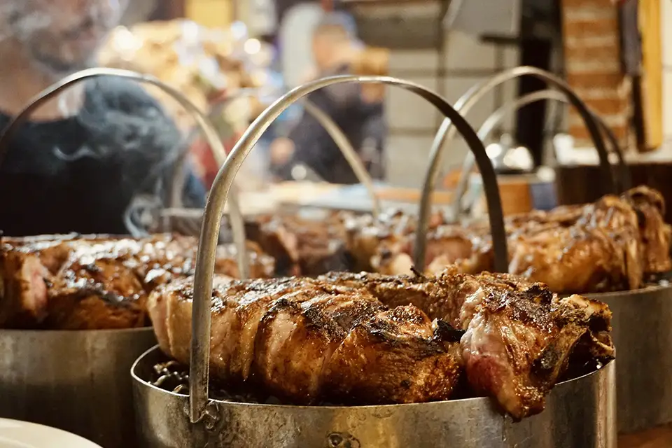 Arrosto di scottona cotto a bassa temperatura con anelli di porro fritto, patate e verdure dell’orto al forno