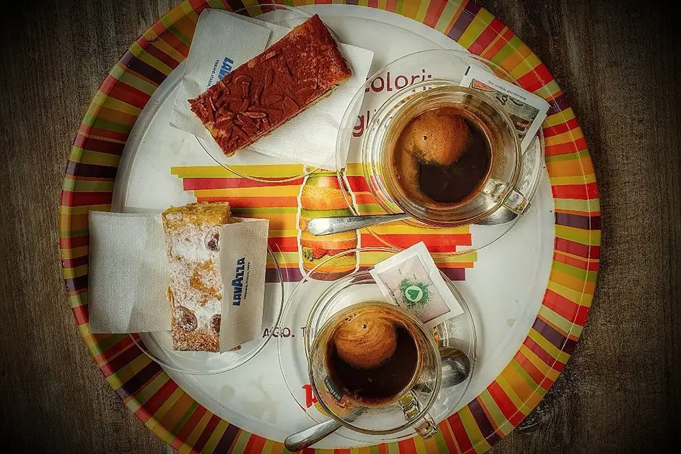 Caffè servito su pirofiline con torta di taglioline con mandorle, zucchero e amaretto